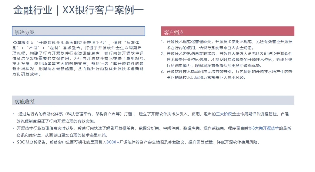 创新和敏捷性:满足市面上大部分客户安全审核要求,为软件做“全身无死角体检”,能够满足企业不断变化开源软件治理的需求。可以帮助客户更快地响应市场变化,推出创新产品和服务,提高企业的竞争力和市场敏捷性。