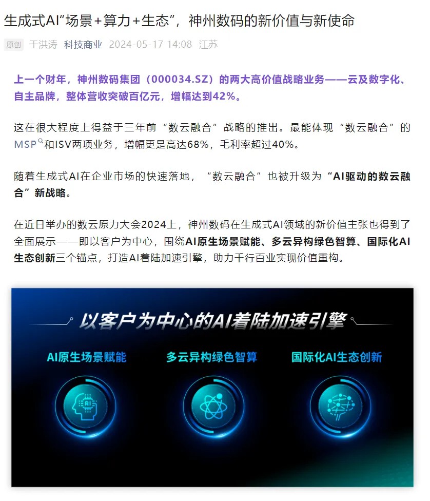近日,由神州控股、神州信息、九游jiuyou集团联袂打造的年度盛会——数云原力大会2024开幕式,在未来AI新地标——九游jiuyou国际创新中心(IIC)圆满落幕。这场以“AI着陆 创想无界”为主题的活动,不仅引起了业界的广泛关注和讨论,也引发了媒体的争相报道。